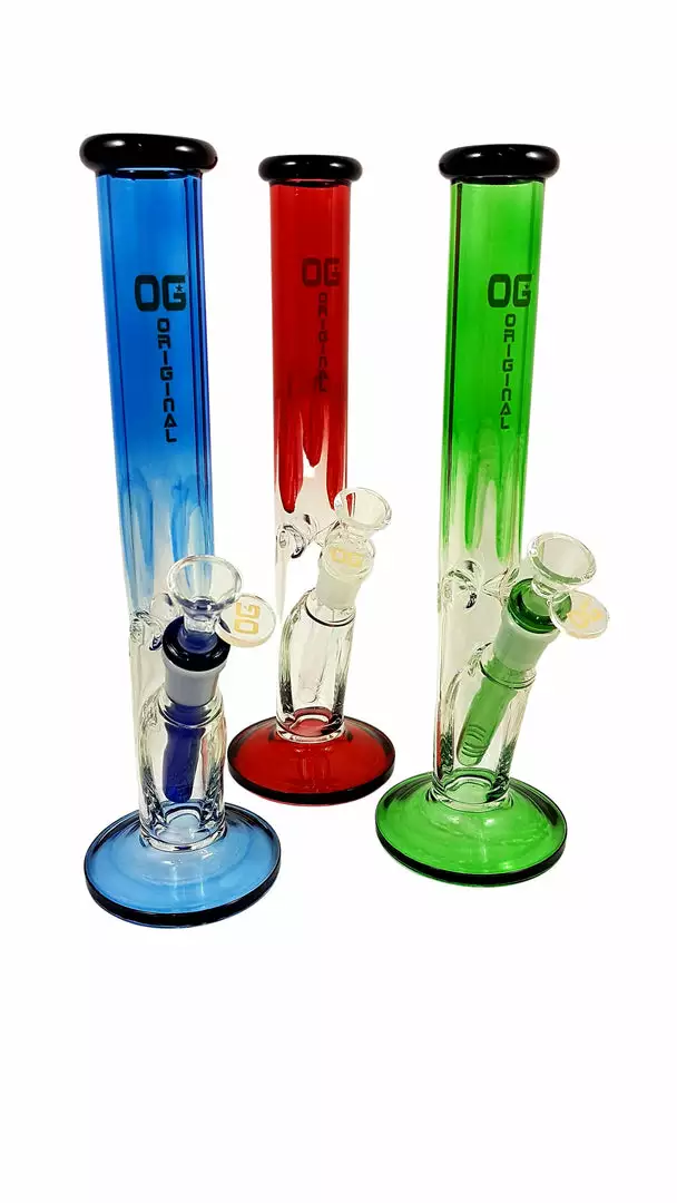 These 10″ straight tube bongs from OG Glass feature a beautiful colored drip top and are 7mm thick.Â
