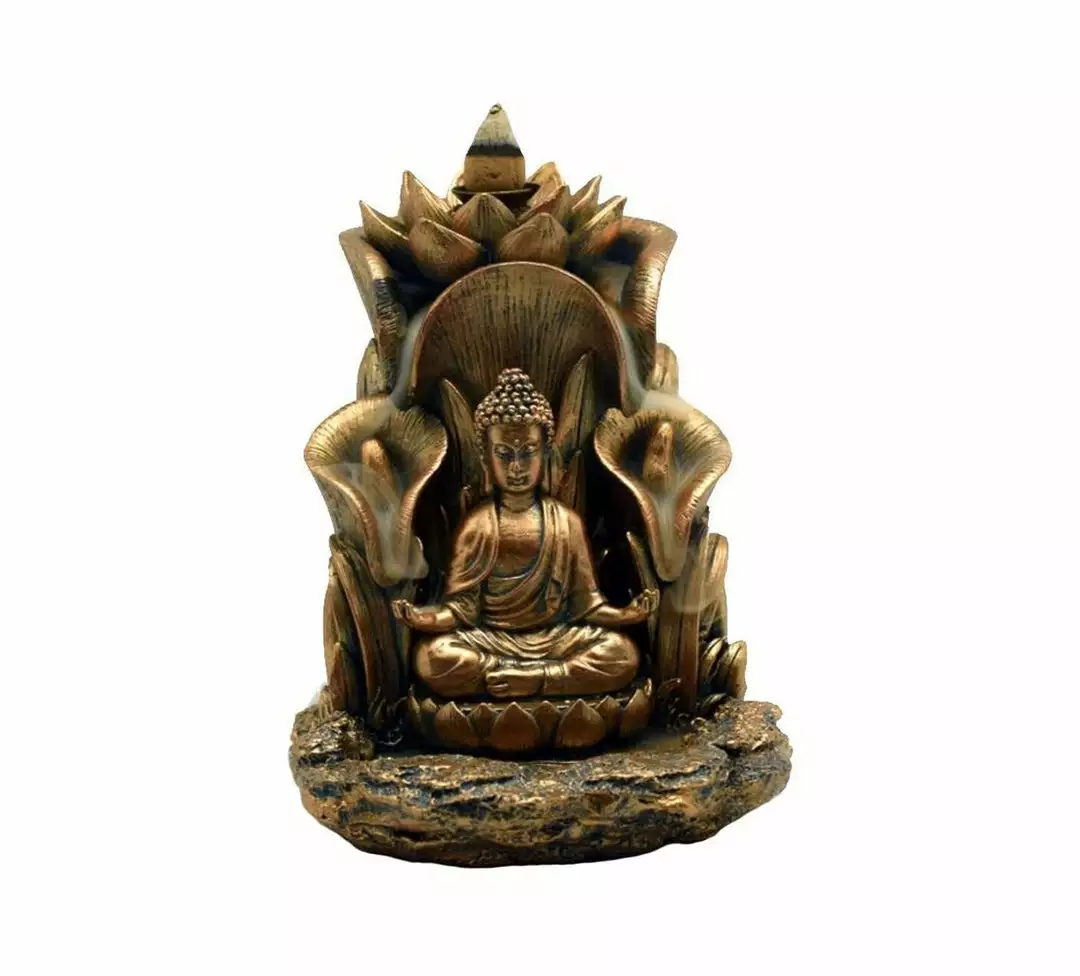 The Buddha Backflow Incense Burner is a 5.5 inch polyresin incense burner specifically made for holding backflow style incense cones. Intricately decorated with a figure of Buddha sitting in Lotus pose. The incense smoke cascades down through the flowers and settles into the pool at Buddha’s feet below. The incense burner includes a single backflow cone and a metal funnel stand for the cone to sit on.