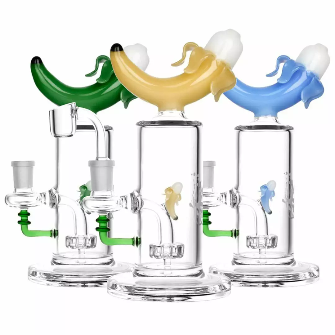 The Pulsar Banana dab rig is B-A-N-A-N-A-S! Standing 8 inches tall and featuring an angled mouthpiece in the shape of a partially peeled banana, these fun novelty dab rigs have a showerhead style percolator with a banana accent and include a 14mm male quartz banger. Banana Dab Rig colours may vary from images.