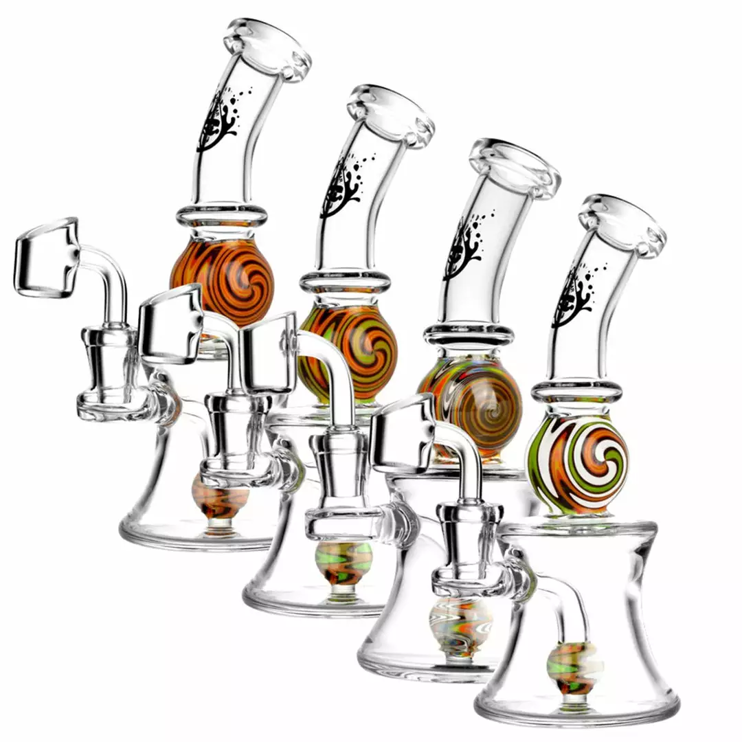 The Pulsar sophisticated Wig Wag Ball mini rig features a unique worked glass design and a matching fixed ball-style perc downstem that filters smoke for cooler, smoother hits. These beautiful, unique concentrate water pipes are made of durable borosilicate glass with worked glass ball accents, stand just 7.5 inches tall, with a 14mm female joint and includes a 14mm male quartz banger.