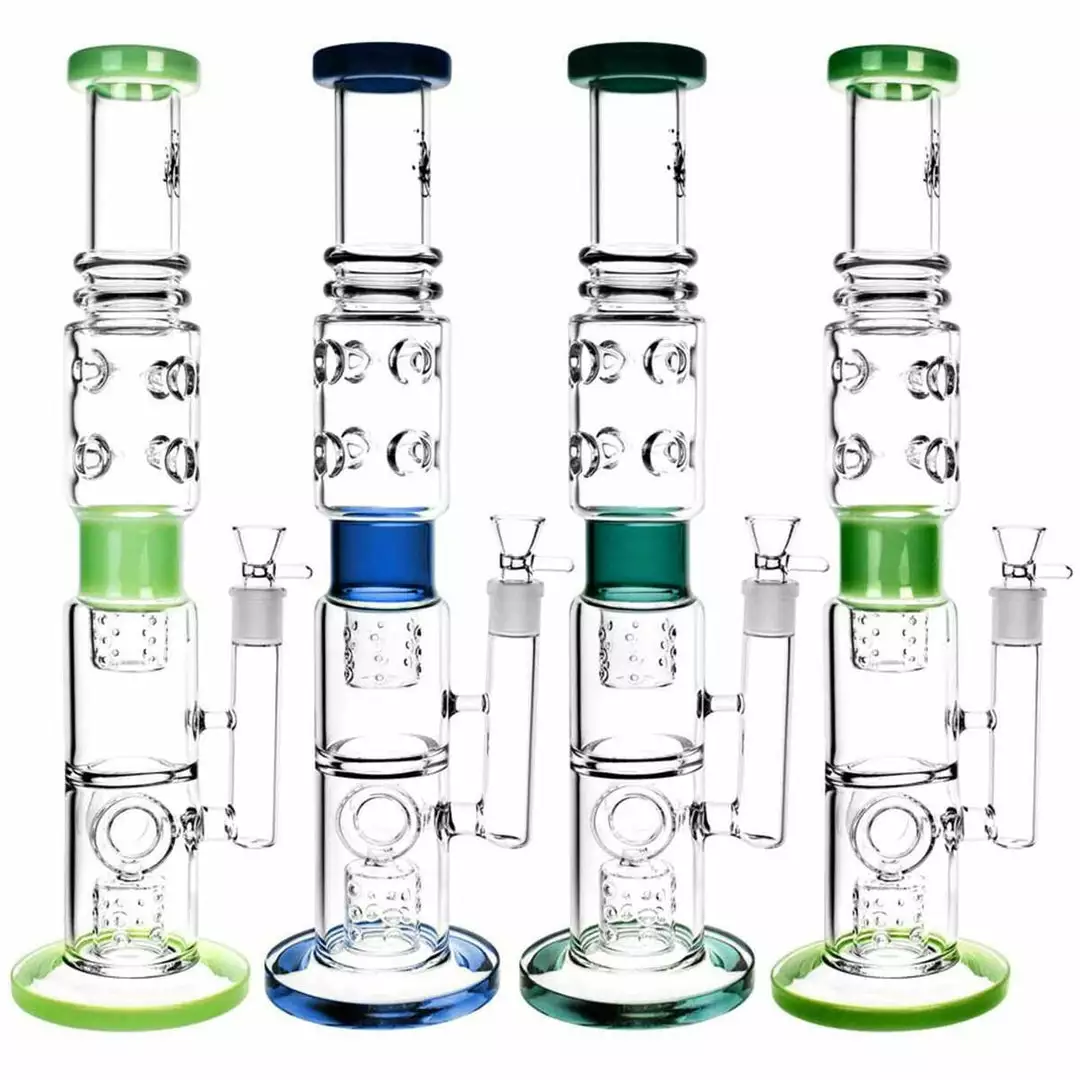 These quality water pipes by Pulsar measure 18 inches tall with a 19mm female slide joint. Featuring two sponge percolators and and multi-pinch ice catcher. This borosilicate glass pipe is ready to cool down smoke quickly allowing for larger hits. Colours vary from images.