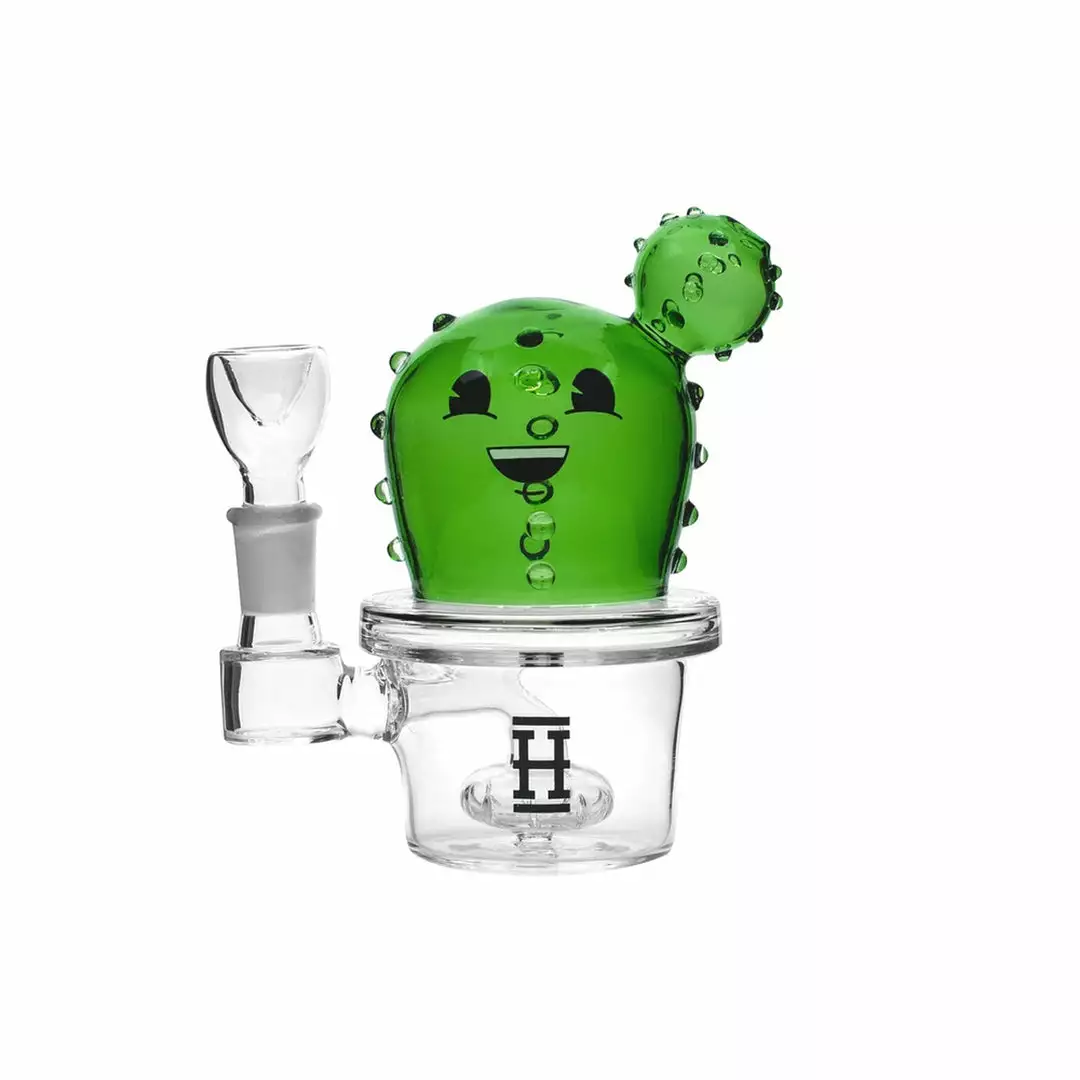 Introducing, the Hemper cactus bong!! Standing 6″ tall this happy cactus dab rig sure packs a powerful scary punch! The hand-blown cactus figurine has a sturdy and wide flower pot base making it perfect for dry herb bowls OR a fully functional e-nail setup.