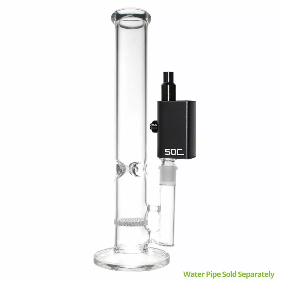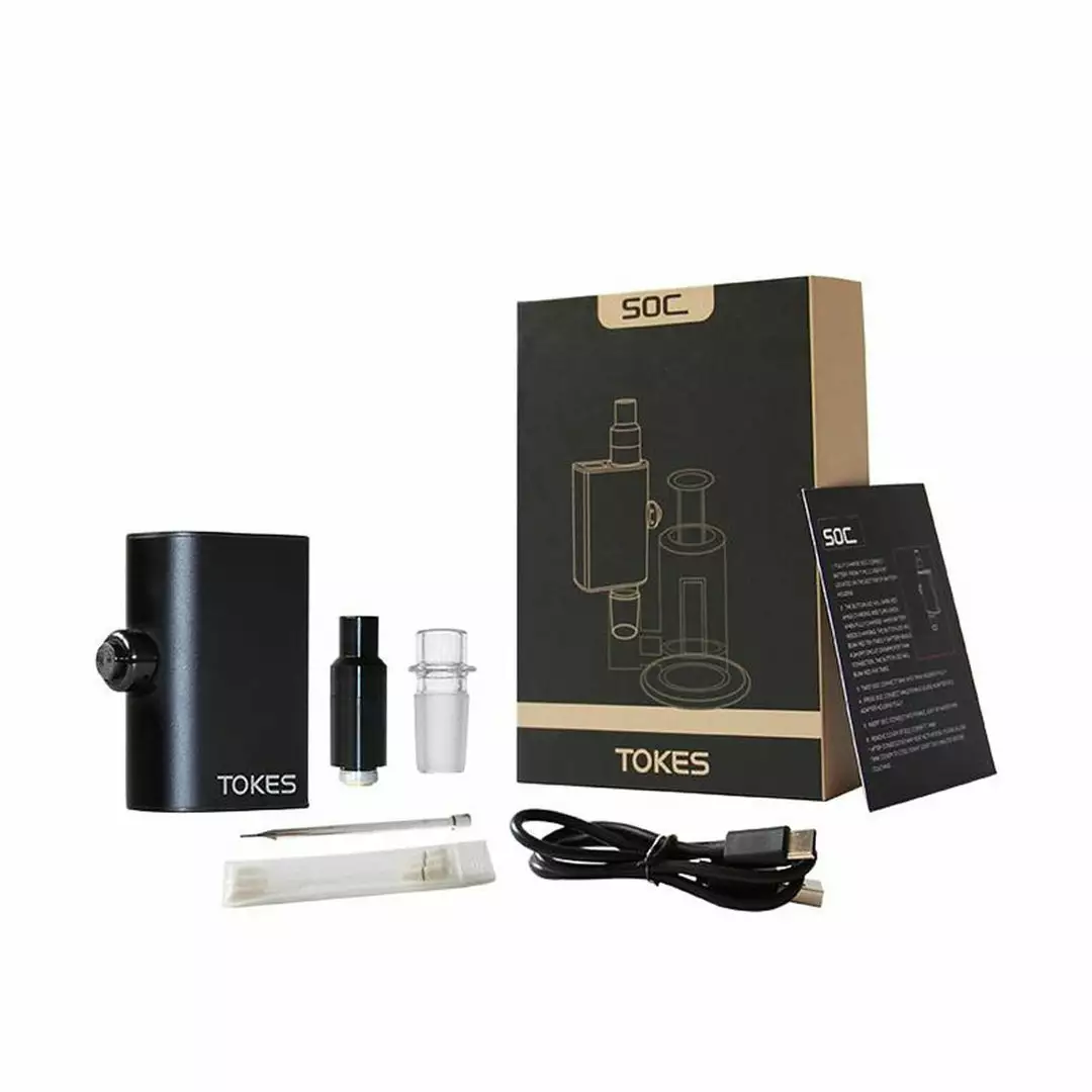 The SOC Tokes from Green Light Vapes is a dual use wax vaporizer with a 14mm male water pipe adapter that makes this vape compatible with most water pipes. The SOC Tokes has 2 mode options use for wax or mod for E-liquid, an adjustable flow hole will make you enjoy better smoking with big vapour and no burn out. The battery features a 650mAh capacity and has three adjustable voltage settings; 3v(Blue), 3.5v(Green), 4v(Red). The SOC Tokes vape has a magnetic mouthpiece and a type-C USB charging cable.