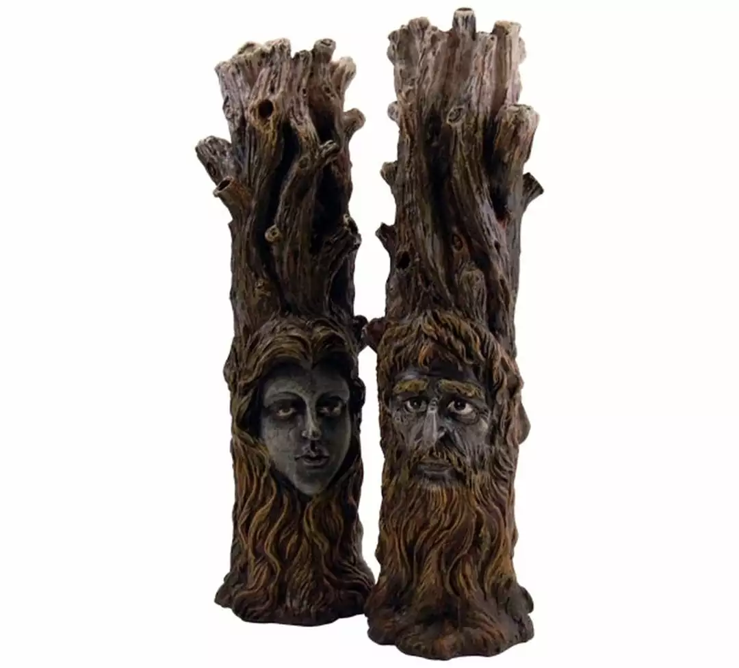 Tree incense holder with faces engraved.