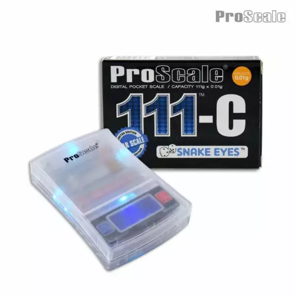 The ProScale 111 Snake Eyes scale is a fun and affordable pocket scale that was built to be durable. The scale’s sturdy construction stabilizes the internal components, while a removable hard cover protects the body or doubles an expansion tray. The ProScale 111 Snake Eyes scale also features a large backlit blue LCD display, an easy to use 2-button interface and an energy saving auto-off function.