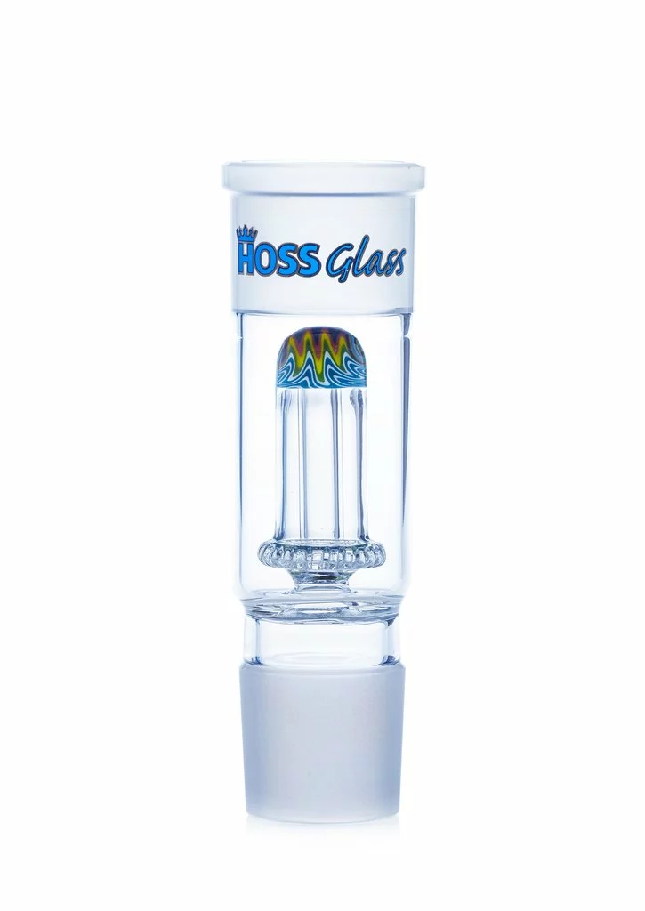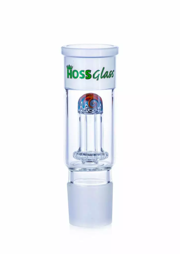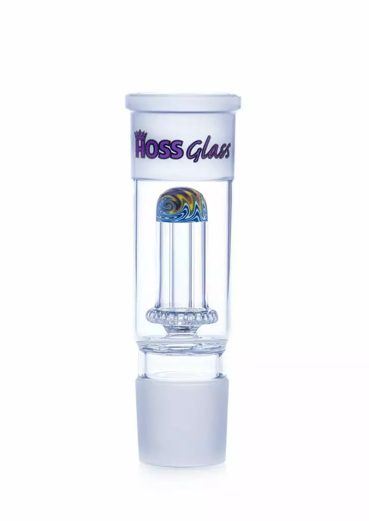 Perfect as a middle-of-the-way build-a-bong piece, this build-a-bong midsection from Hoss Glass has nicely switchbacked colouring on the top of each version/colour’s dome percolator — just for that extra bit of specialty!