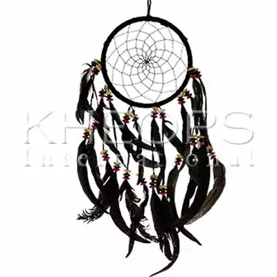 Black Magic: This traditionally styled Dream catcher has been made with tightly wrapped black faux suede. Natural black feathers flow from beaded strands adding movement and style to this striking catcher.