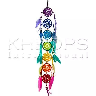 Chakras:Â This stunning seven tiered woven Dream catcher is perfectly assembled with harmonious vibrant elements. Each color represents one of the seven chakras. Feathers in matching shades flow from beaded strands, adding texture and movement to this beautiful Dream catcher.Â