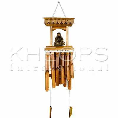Double Row Buddha Temple Bamboo Windchimes:Â This unique wind chime features a polyresin Buddha seated beneath his temple, deep in meditation. Under the temple inspired base is a double row of chimes and two clappers. Crafted from natural bamboo. Hang this wind chime where you want to welcome friends and hear the calming, meditative tones of the wind. Our popular Bamboo Windchimes are handcrafted in Indonesia, where the climate is usually hot and humid. When submitted to extreme changes of temperature or humidity they are susceptible to crack. Minor cracks are considered a condition inherent to these products, and will not affect the gentle sounds created by a nice summer breeze.