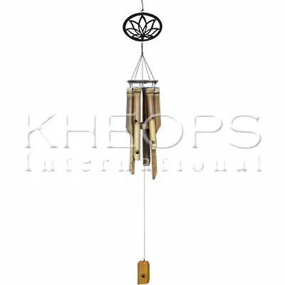 Lotus Bamboo Windchimes:Â A black lotus flower has been strung atop the base of this natural bamboo chime. The lotus flower pattern continues on to each of chimes and the clapper. The chime has a lovely natural tone. Our popular Bamboo Windchimes are handcrafted in Indonesia, where the climate is usually hot and humid. When submitted to extreme changes of temperature or humidity they are susceptible to crack. Minor cracks are considered a condition inherent to these products, and will not affect the gentle sounds created by a nice summer breeze