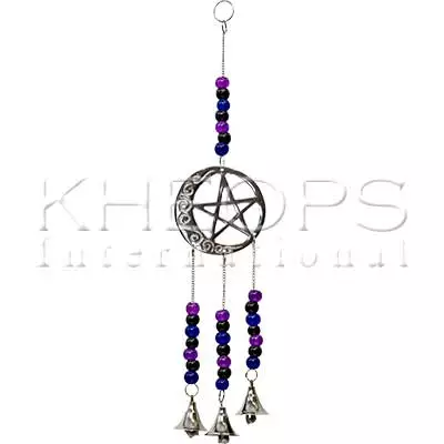 Pentacle and Moon Hanging Bells:Â This Pentacle and Moon chime is made from polished brass with beautiful purple bead accents. From the 3-inch diameter pentacle hang three bells, that when blown, make a mystically enchanting sound.