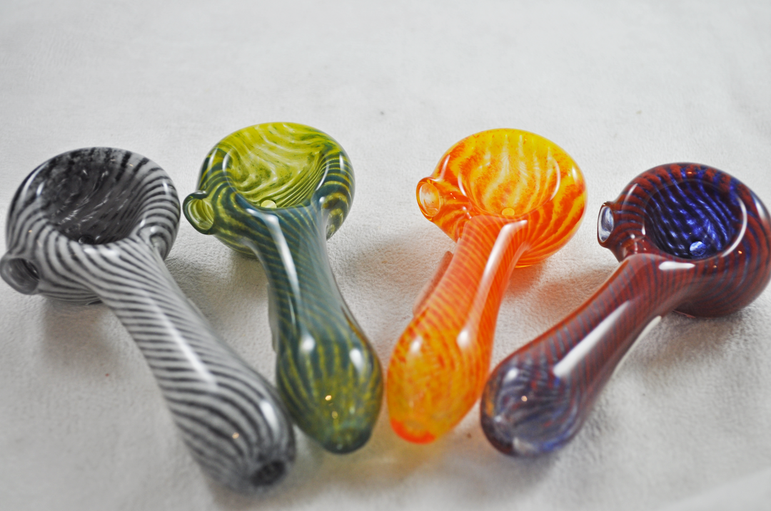 These mini twisted frit pipes are the perfect pocket sized heady pipes and though they’re small there’s plenty of detailed line work in these pieces.Â