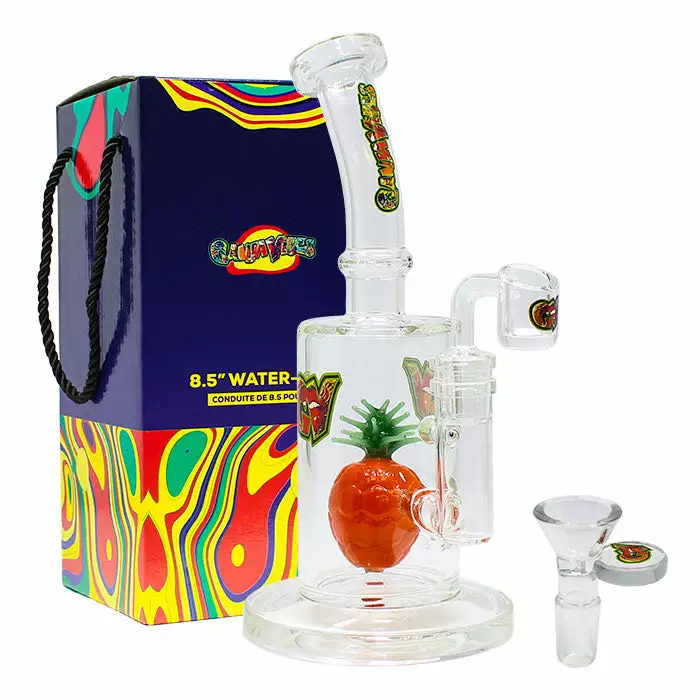 The 8.5 inches Ganja Vibes Water Pipe / Dab Rig is of Dual use. It can be used as a bong, by placing the 14mm bowl, or as a Dab Rig, by placing the quartz banger. Toke as per your preference. The cylindrical water pipe comes along with a fruit shaped Perc. The water pipe is 8.5 inches tall and comes along with a easy to carry designed box, bowl and quartz banger.