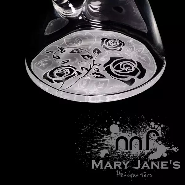 Anything can grow in the right conditions, including roses from unspecified dark potions… This 14” beaker bong walks poetic lines in its depictions of deeply sandblasted roses on the tube and base.
