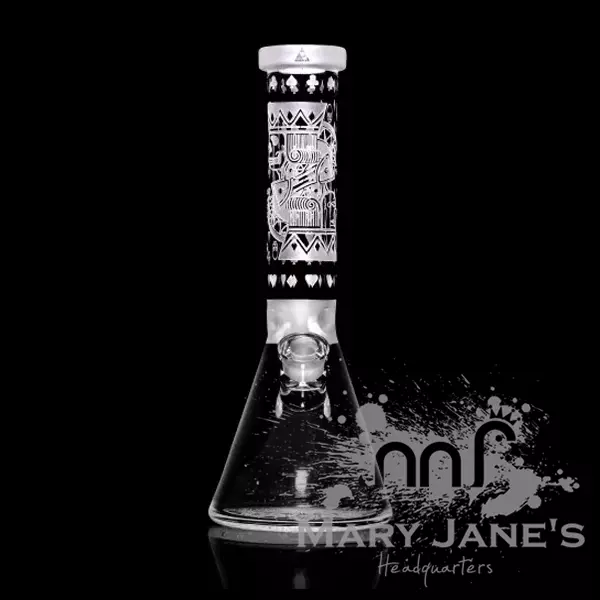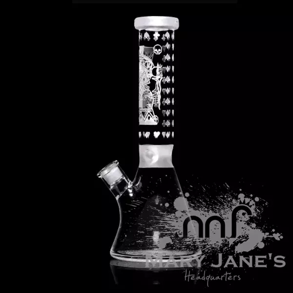 Inspired by games of chance and tyrant kings, this 14” beaker bong shows that kings can become reapers with a roll of a dice… With deep sandblast details on the tube and base, this beaker makes a nice addition to any skull lovers collection.