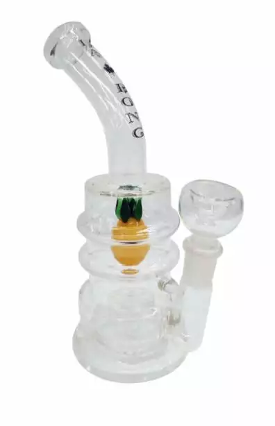 These little guys stand 9″ tall, feature a bent neck, a 6 hole perc, a cute little glass pineapple on the inside of the piece, and a 90° 14mm flower bowl.