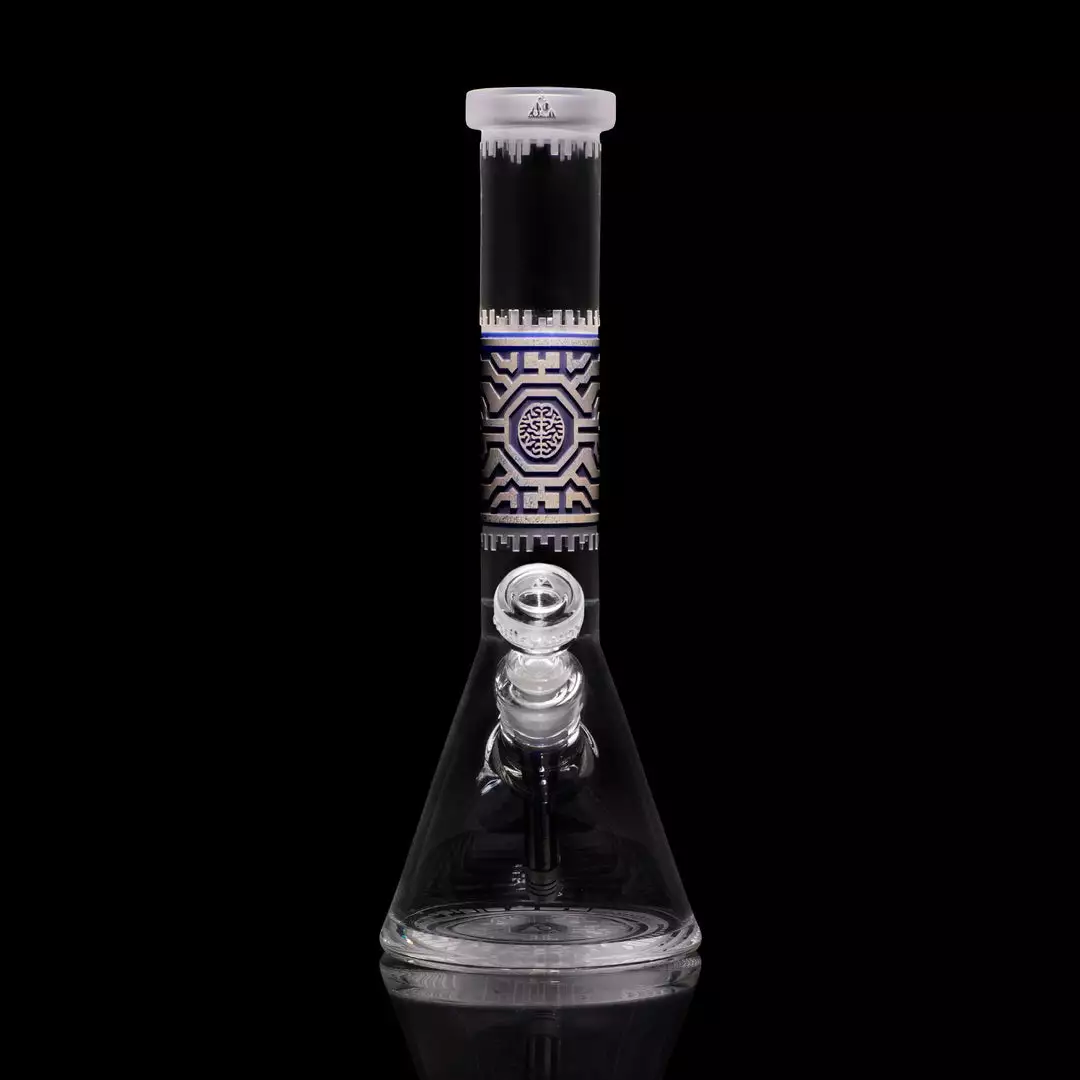 This 15” beaker bong is from the Bio-Tech Collection. The design depicts the pathways the mind takes when communicating via metaphysical frequencies. The centre piece provides an ergonomic grip. It features our signature brain icon and comes with a color layered downstream & Orbit bowl. The base includes a double layer sandblast and has an ice-restriction.