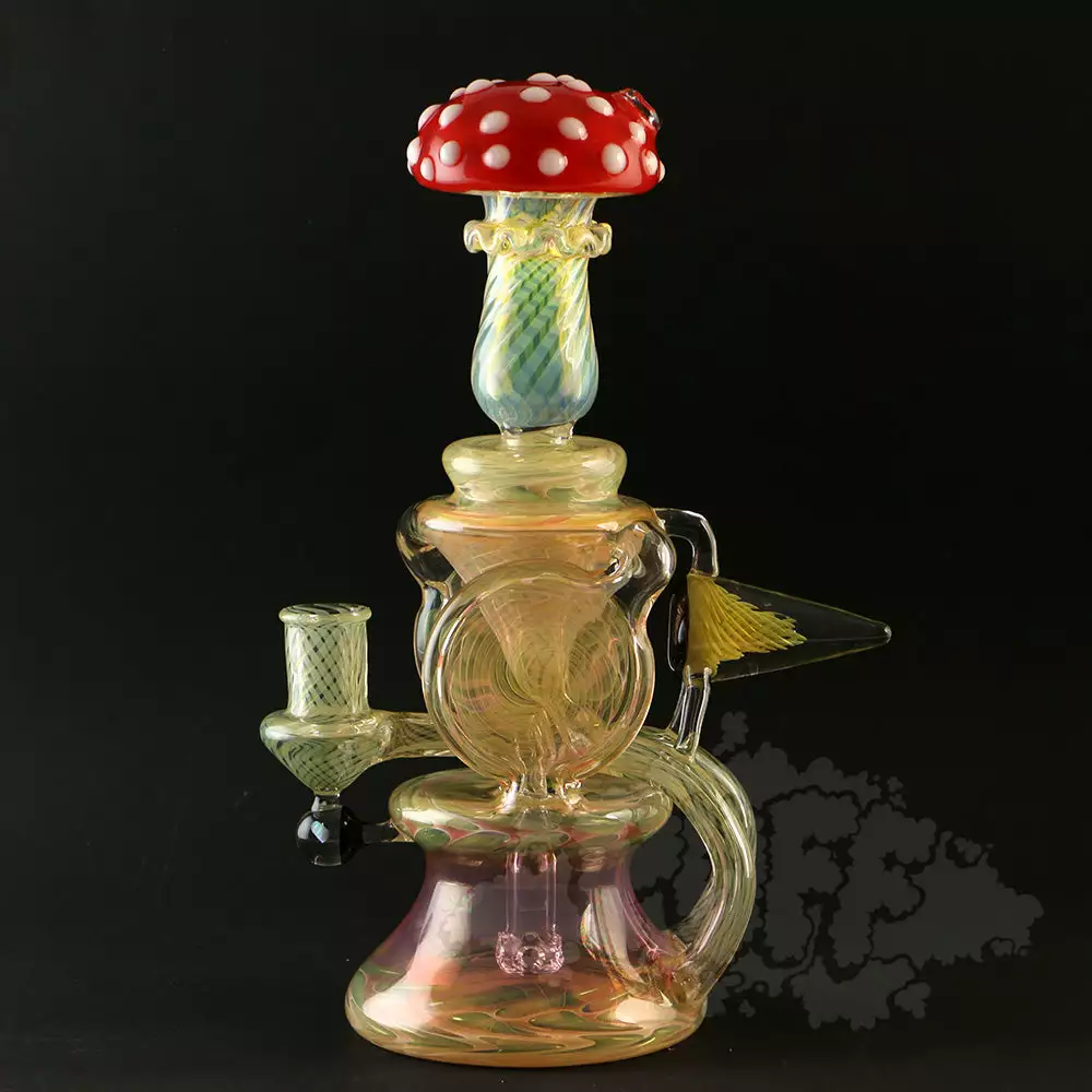 The Double Double by Eckardt Glass! This work of art features a mushroom cap mouthpiece and a fumed twisted neck. Also featuring several attached glass art pieces on the dab rig. This piece is an amazing addition to anybody’s collection!