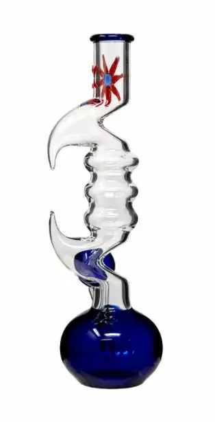 Another edgy soft glass bong with star detail at the mouthpiece. Glass tube created in a ridged form, along with the double kinks provide good grip.