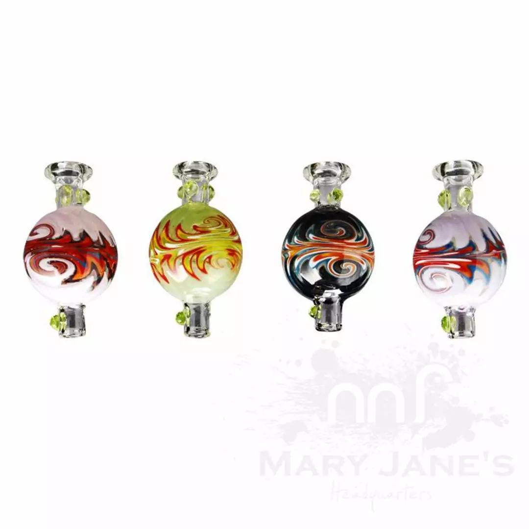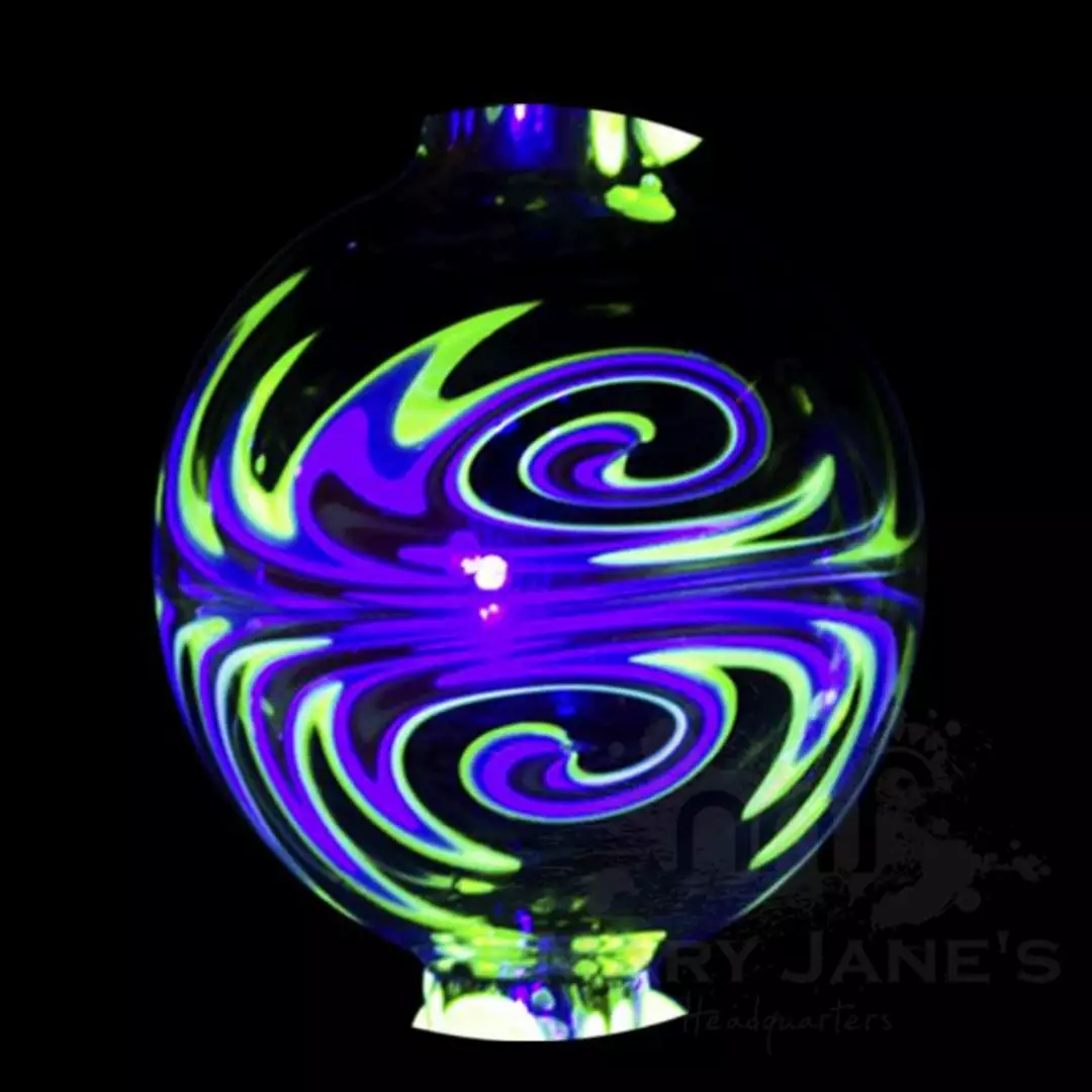 Gear Premium Switchback Bubble Carb Cap with UV Reactive Accents is a perfect addition to any dab rig setup. Under UV light these caps will light up. Great addition to any collector of UV light glass rigs. These mate perfectly with large flat top quartz bangers. Â