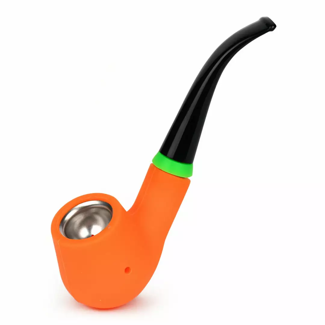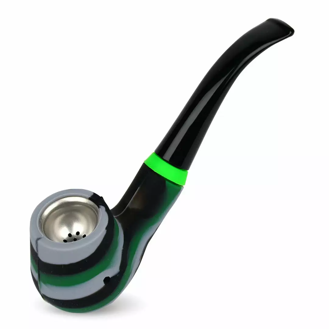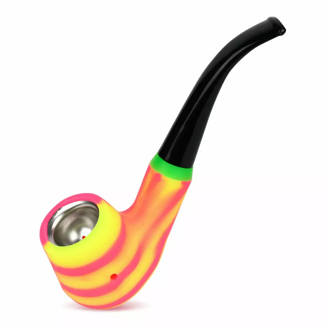 The popularity of this pipe is no mystery. Made from BPA-free, food safe, dishwasher safe silicone, this 5.5″ Classic Sherlock Pipe pays homage to a timeless silhouette. Comes in Camo, Green, Orange and Pink/Orange Swirl. Â