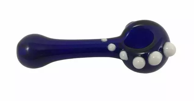 This Red Eye Glass pipe features a dark blue color along with a white dot swirl around the bowl!