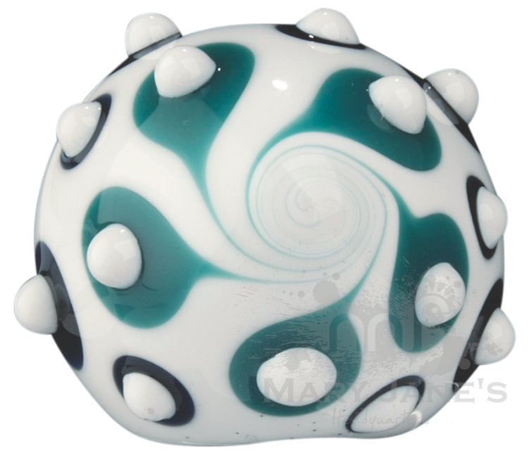 The solid white colouring on the glass will prevent any resin buildup from showing through, and the beaded design turns into a super trippy swirl on the bowl’s front end.