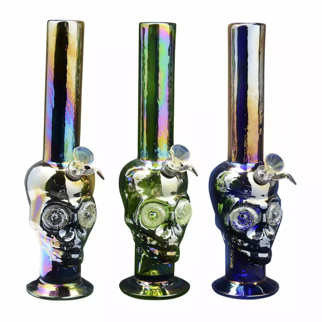 Don’t let this metallic finish bong go to your head! The Platinum Metallic Skull Tube has two distinctive diamond eyes and is available in assorted colours.